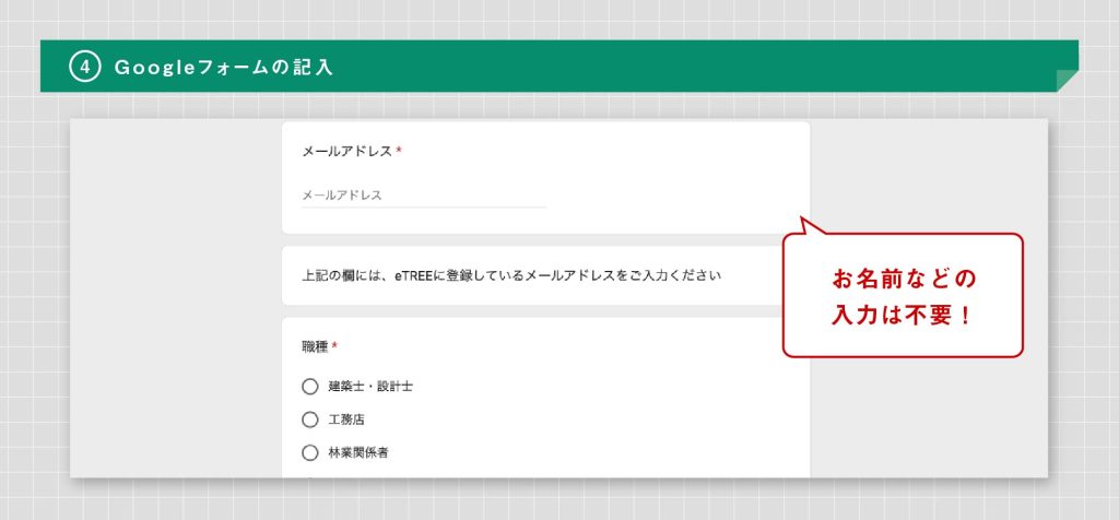 ④Googleフォームのページへ飛びますので、メールアドレス以下をご入力ください。お名前等の入力は不要です。